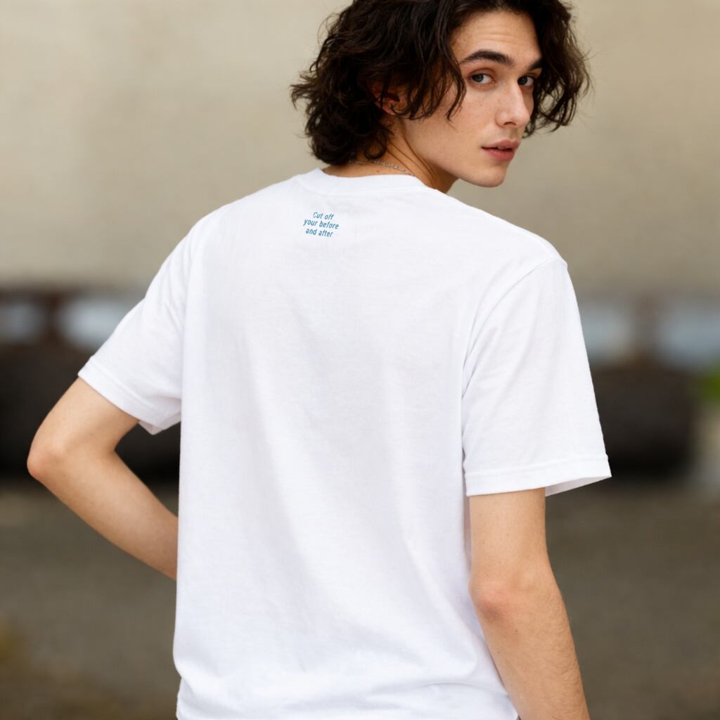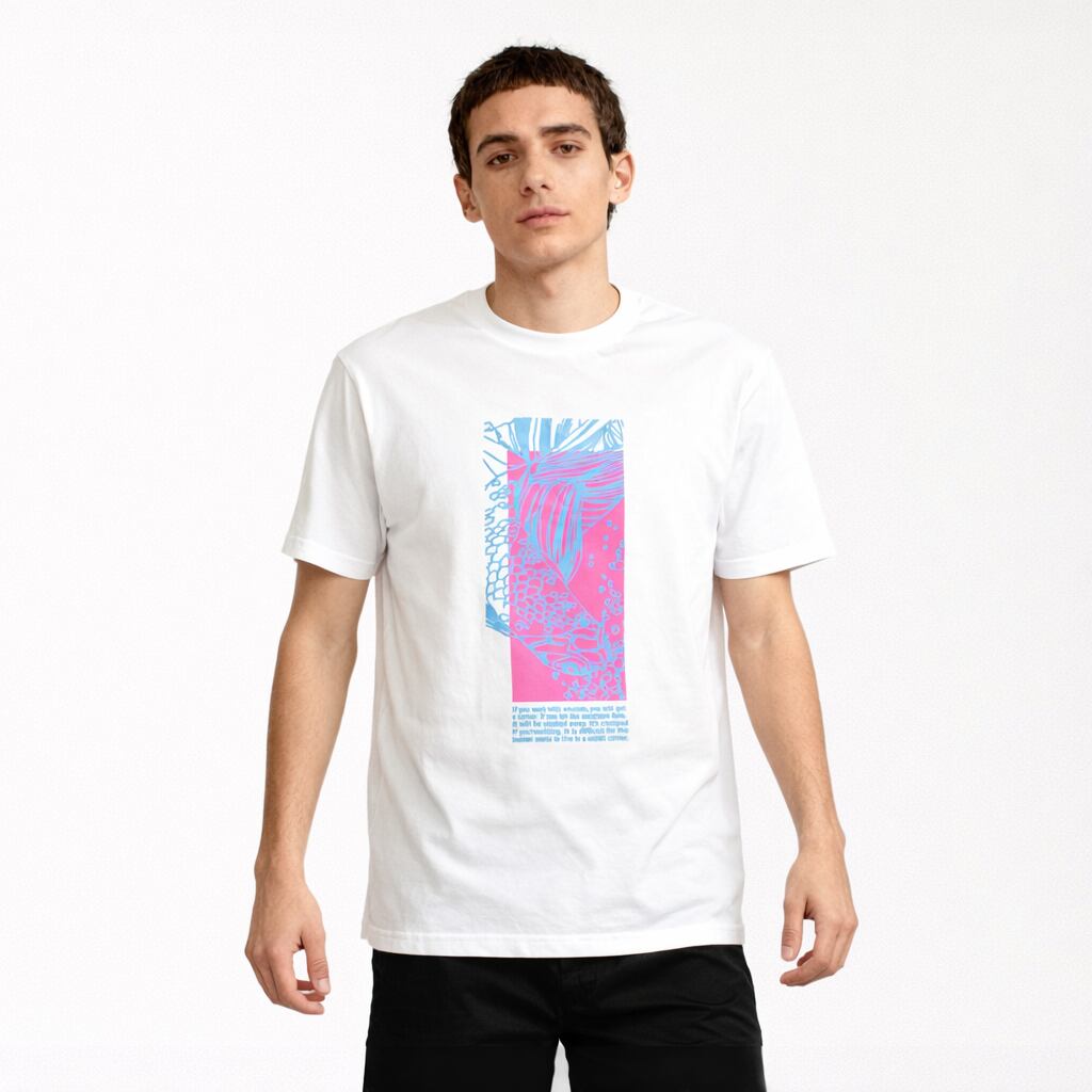 白地に映えるアートデザインで、軽やかな印象をまとえる一枚です。